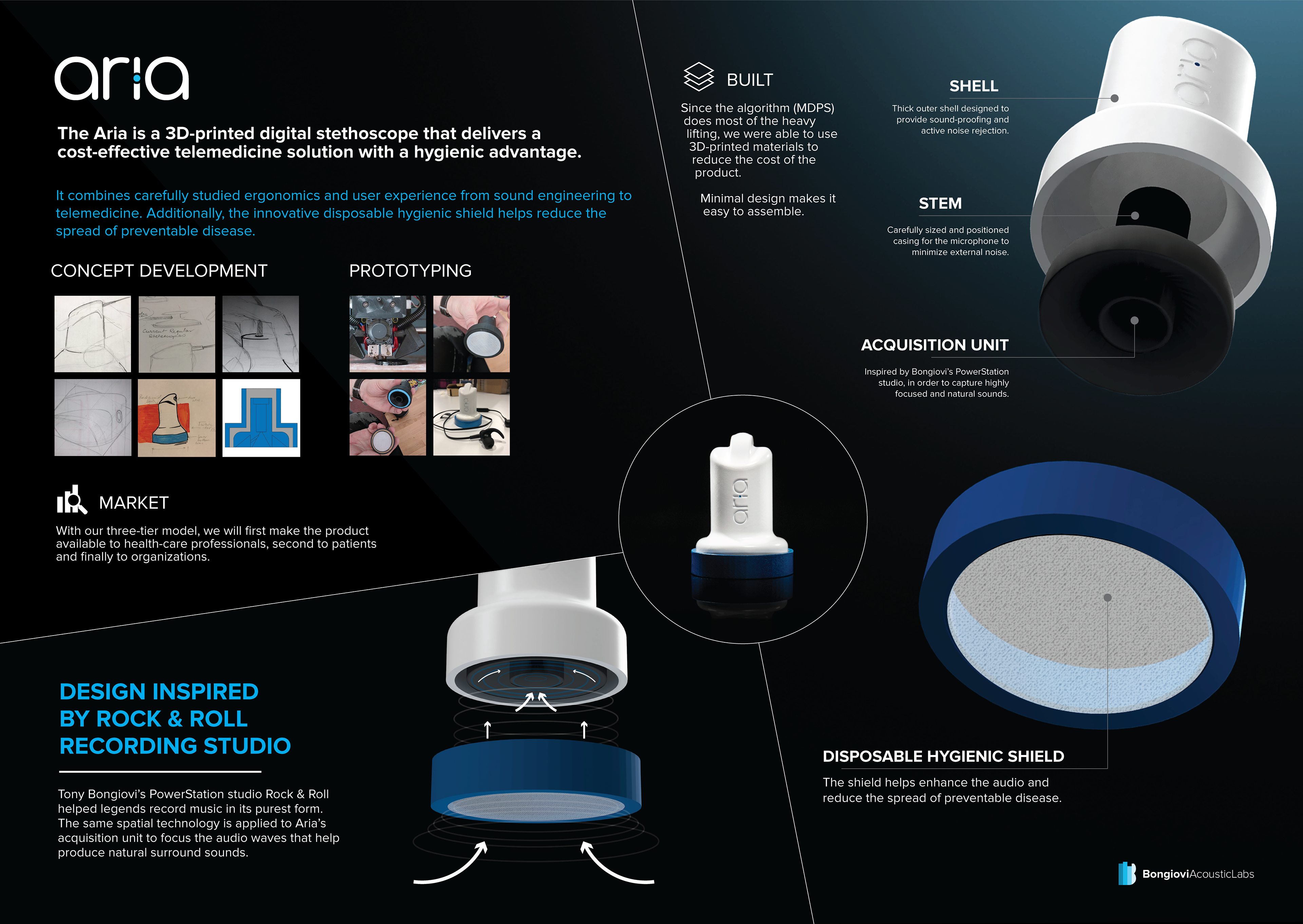 65% of Americans say that healthcare is too expensive and almost 9% of adults have no medical insurance coverage. In fact, more than one third of Americans have claimed not to visit their doctor when they should have because of cost. Bongiovi Acoustic Labs aims to show that audio technology can be applied affordably to medical devices, to make healthcare more accessible. Bongiovi's algorithm has the ability to remaster audio in real time. It allows the Aria to instantly map the shortcomings lost in digital conversation, restore frequency responses and deliver advanced audio quality. Through our customized telemedicine platform, the Aria offers remote patient monitoring to healthcare professionals and patients across the globe.