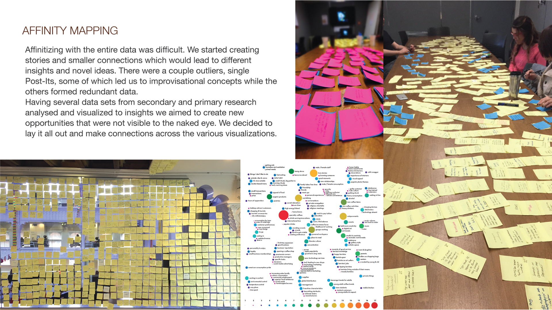 Concept: In Savannah, Georgia there is an abundance of coffee shops that we hoped to uncover their collective and individual contributions to the fabric of the town. Based on research findings, we wanted to offer innovative solutions that enhance rather than disrupt the existing culture. Role: The project was a collaboration of 4 people that had experience in different fields of the creative industry. In such a scenario we all were responsible of wearing multiple hats at different times to share the experience. While the leadership role passed on from person to person, I dealt with the strategy and analysis post research. While creating schedules, assigning responsibilities and being a good listener to the group members, I carefully knit various ideas together to create few, yet stronger concepts.